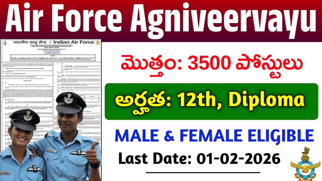 Air Force Agniveervayu Recruitment 2026: ఇండియన్ ఎయిర్ ఫోర్స్‌లో ప్రభుత్వ ఉద్యోగం సంపాదించడం ద్వారా తమ కెరీర్‌ను సెట్ చేసుకోవాలనుకునే యువతీ యువకులందరికీ ఒక శుభవార్త ఉంది. అగ్నివీర్వాయు ఇంటేక్ 01/2027 ను ఇండియన్ ఎయిర్ ఫోర్స్ జనవరి 12, 2026న విడుదల చేసింది. ఇది మీకు ఉద్యోగం పొందడానికి గొప్ప అవకాశంగా నిరూపించబడుతుంది. అందుకే, ఈ వ్యాసంలో ఎయిర్ ఫోర్స్ అగ్నివీర్వాయు రిక్రూట్‌మెంట్ 2026 గురించి మేము మీకు వివరంగా తెలియజేస్తాము.